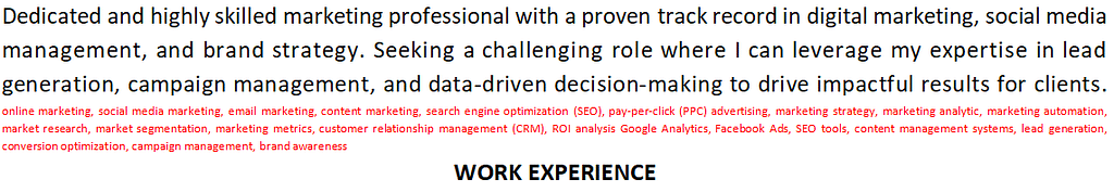 ¿Funciona este concepto? Sí, puede aumentar tus posibilidades de captar la atención del reclutador y posiblemente pasar el ATS. Sin embargo, al utilizar esta práctica es muy probable que te descarten a la hora de revisar manualmente tu resumé.